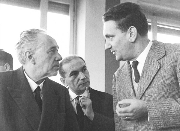 Giulio Natta con i collaboratori Italo Pasquon e Piero Pino (1963)